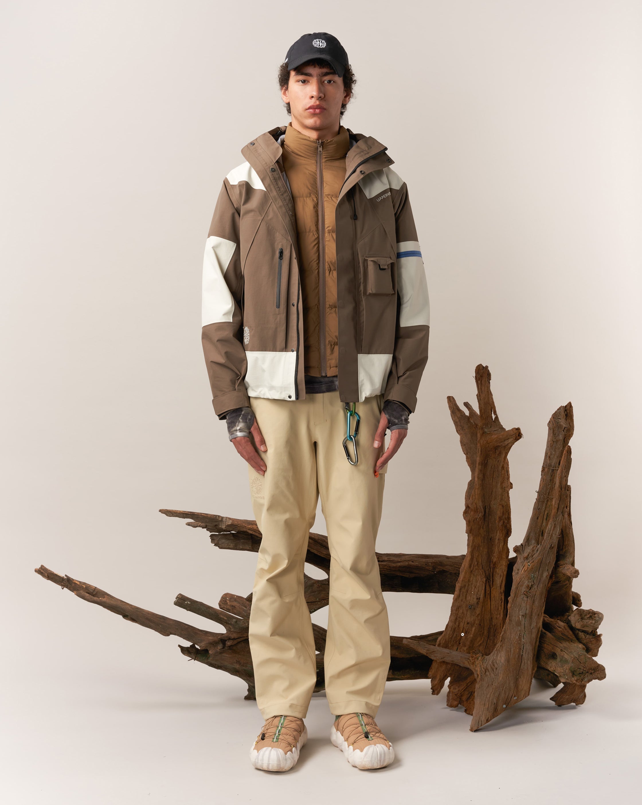 The shell uses GRATE™ 3-layer composite fabric of nylon grid, with PORELLE® P620 MEMBRANES high-transparency biomimetic film, providing 21,000MMH₂O waterproof and 9,000G/M²/24H breathability, and features DWR for robust water resistance.