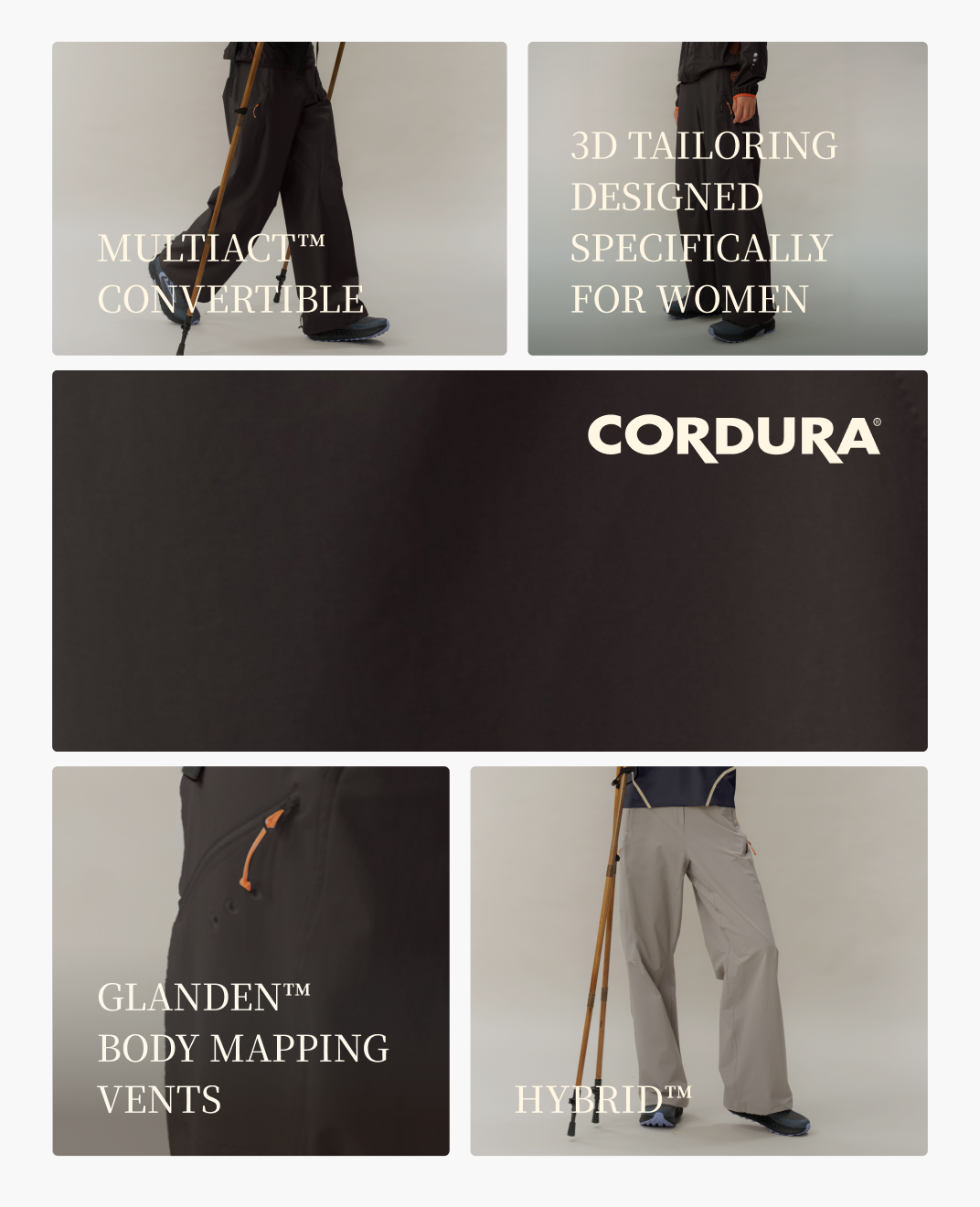Made of CORDURA® nylon stretch fabric, it features four-in-one protection of breathability, water resistance, wind resistance, and durability, with 3D cutting specifically for women, GLANDEN™ human engineering sweat pattern map, HYBRID™ functional zoning, and PUMPUP™ muscle support.
