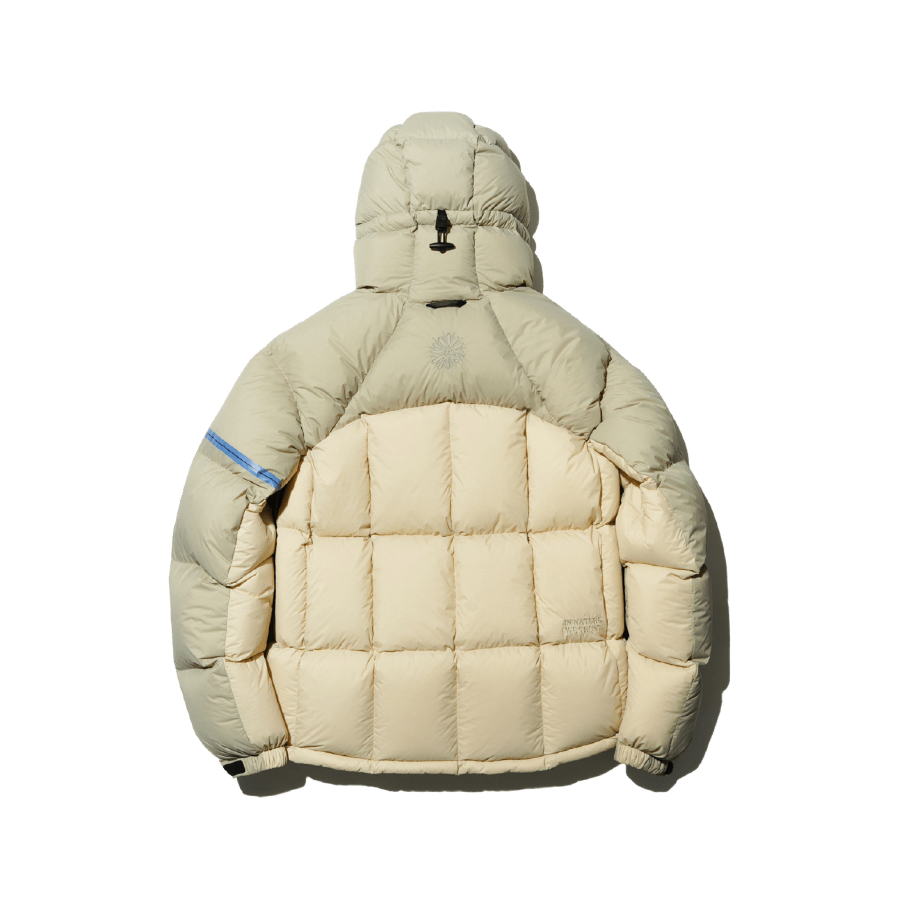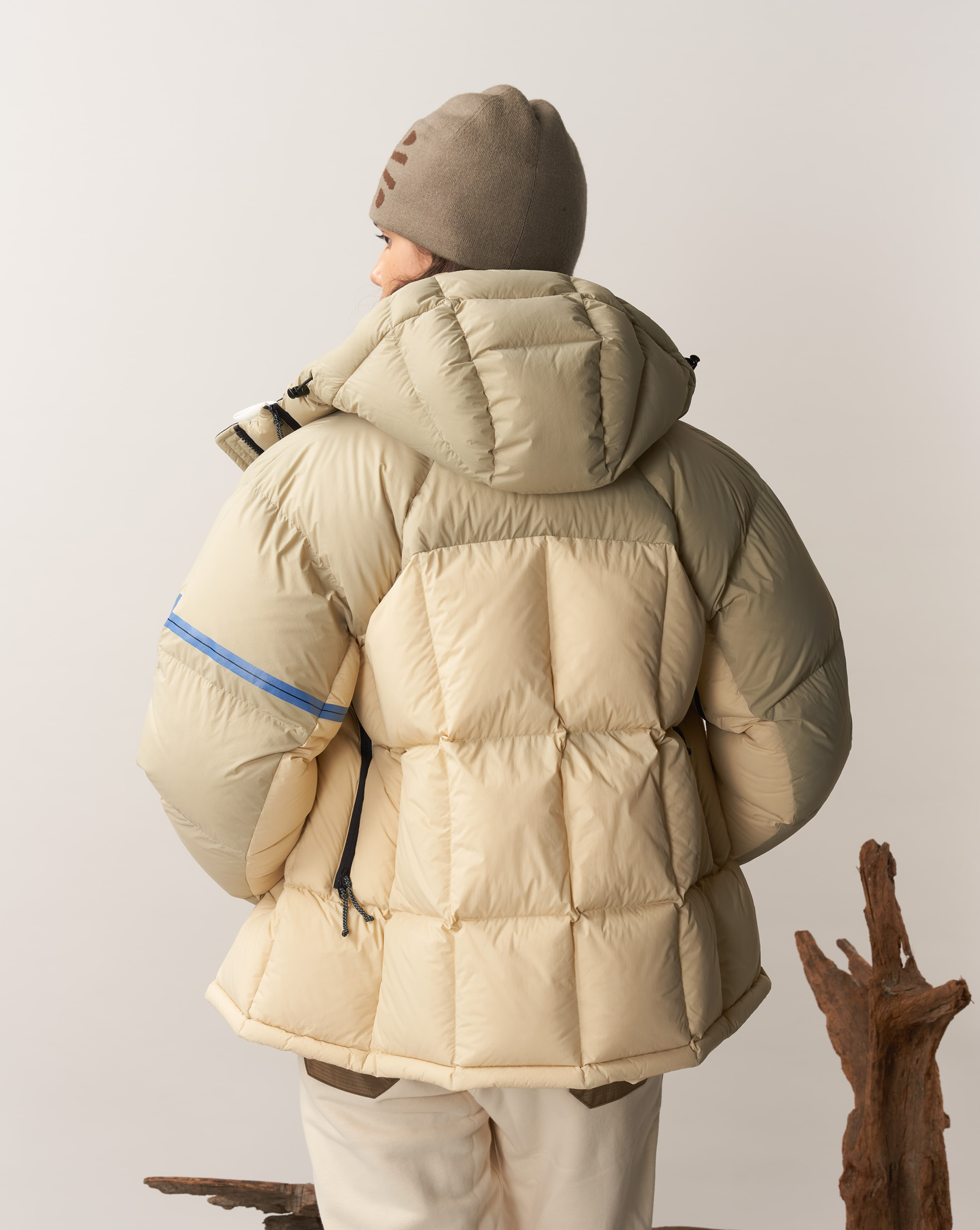 The AJAX+ down jacket features a combination of CORDURA® 20D abrasion-resistant and fire-resistant treated 20D fabric. This combination is designed to reduce the spread of fire in open flame scenarios during outdoor camping, ensuring a certain level of safety. It is insulated with 800-fill power goose down and includes a heat-reflective gold-coated layer to minimize heat loss while maintaining optimal warmth. The jacket is equipped with shoulder straps, underarm ventilation, neck ventilation, and a self-storing feature for added convenience.