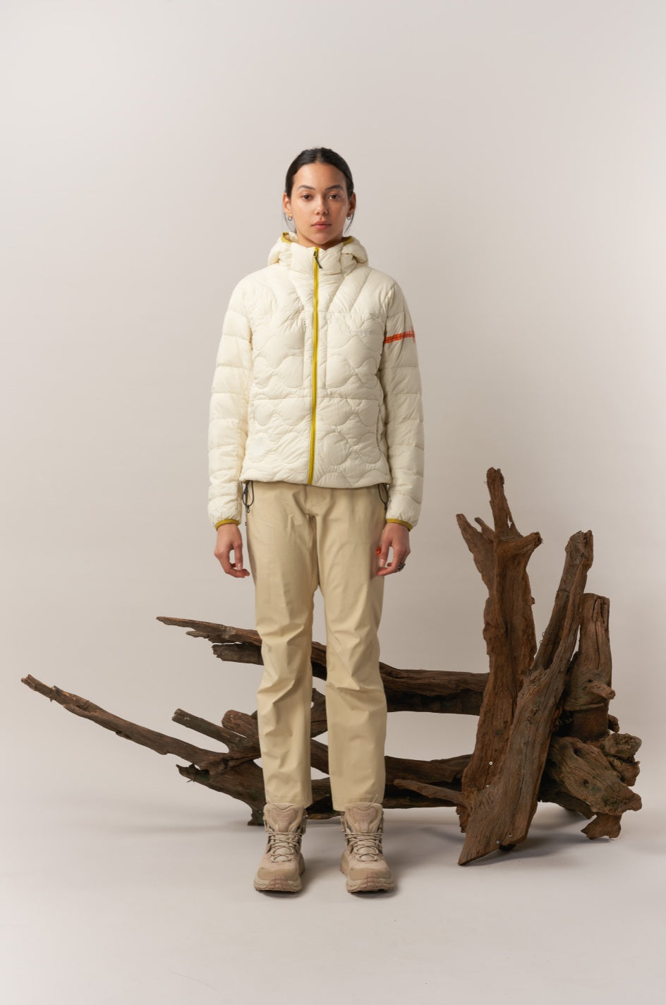 The CID lightweight down jacket features a 20D ripstop fabric, known for its unique matte texture and tactile sensation, ensuring enhanced durability. Filled with 650 fill power white goose down, it provides continuous and comprehensive warmth. There's an internal zipper pocket on the left side for self-storage. The wind hood employs a three-dimensional wrap design that automatically adjusts the fit using elastic bands on both sides to ensure a 360° snug fit, reducing wind penetration when worn.