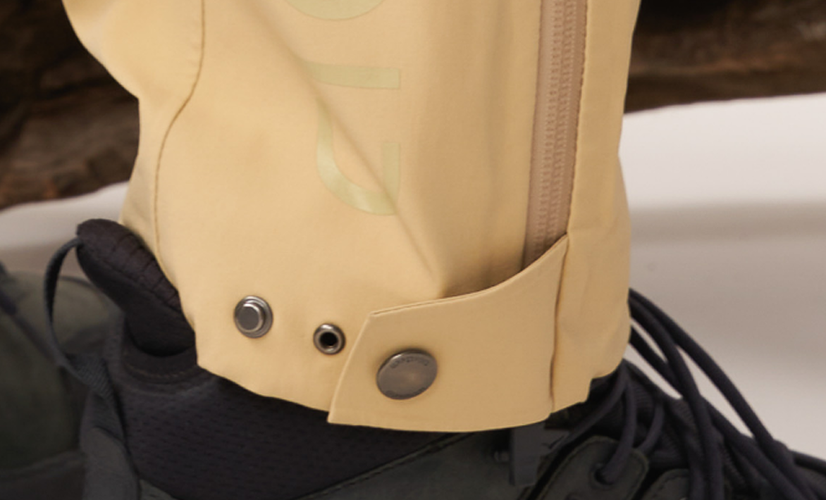 GAIA+ uses BOMBSHELL™ three-layer composite fabric, with a waterproof index of up to 15,000MMH₂O and a breathability index of 15,000G M² 24H, providing stronger protection and functionality. The addition of full-length waterproof ventilation zippers on both sides makes it easier to put on and take off. The loading system at the back waist and articulated knees increase mobility and breathability. The ankle cuffs can be adjusted freely.