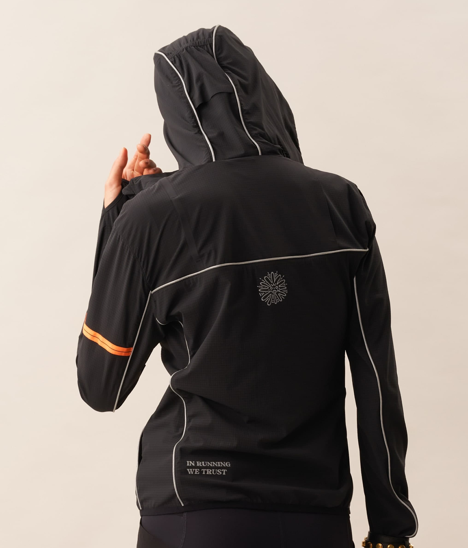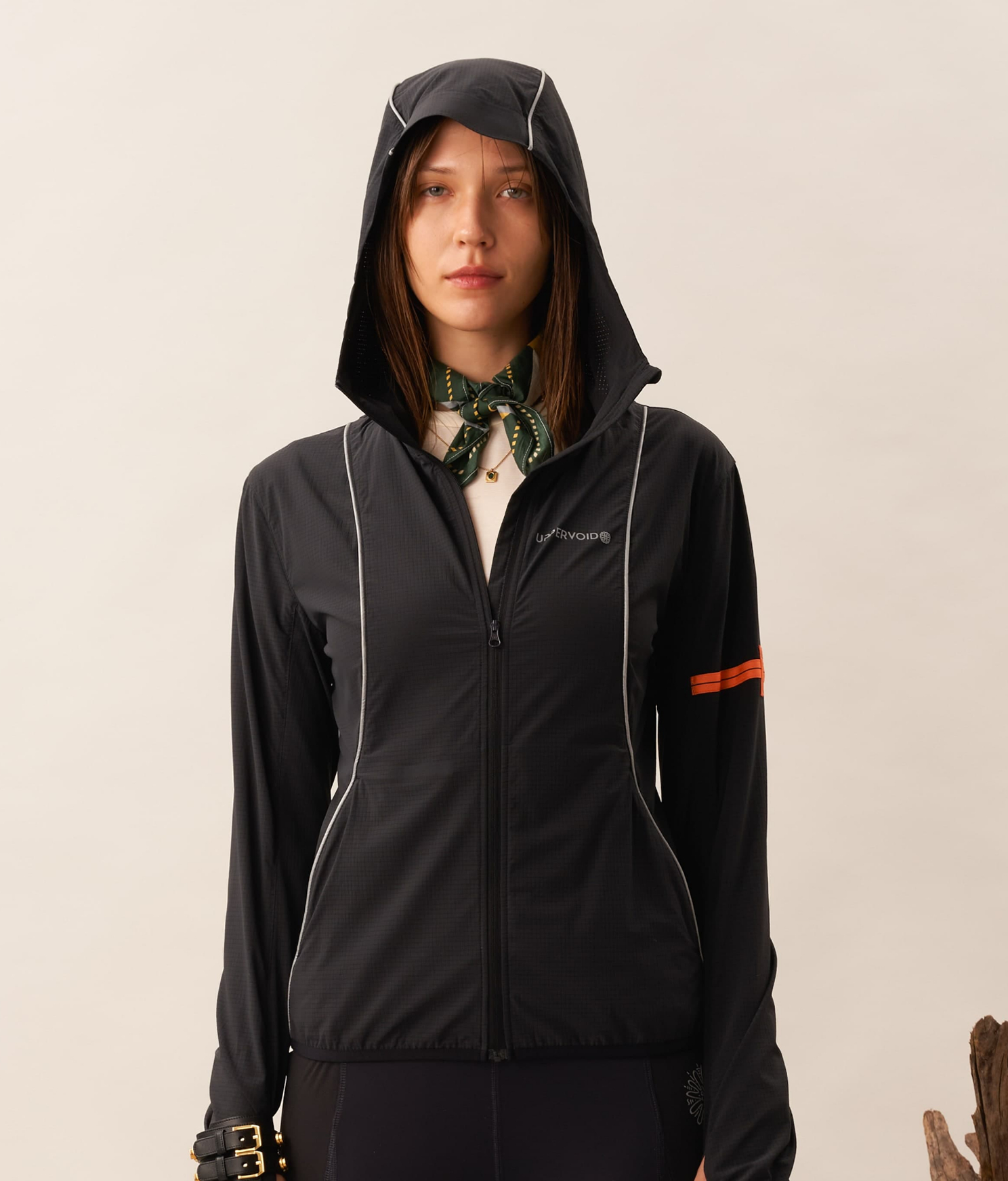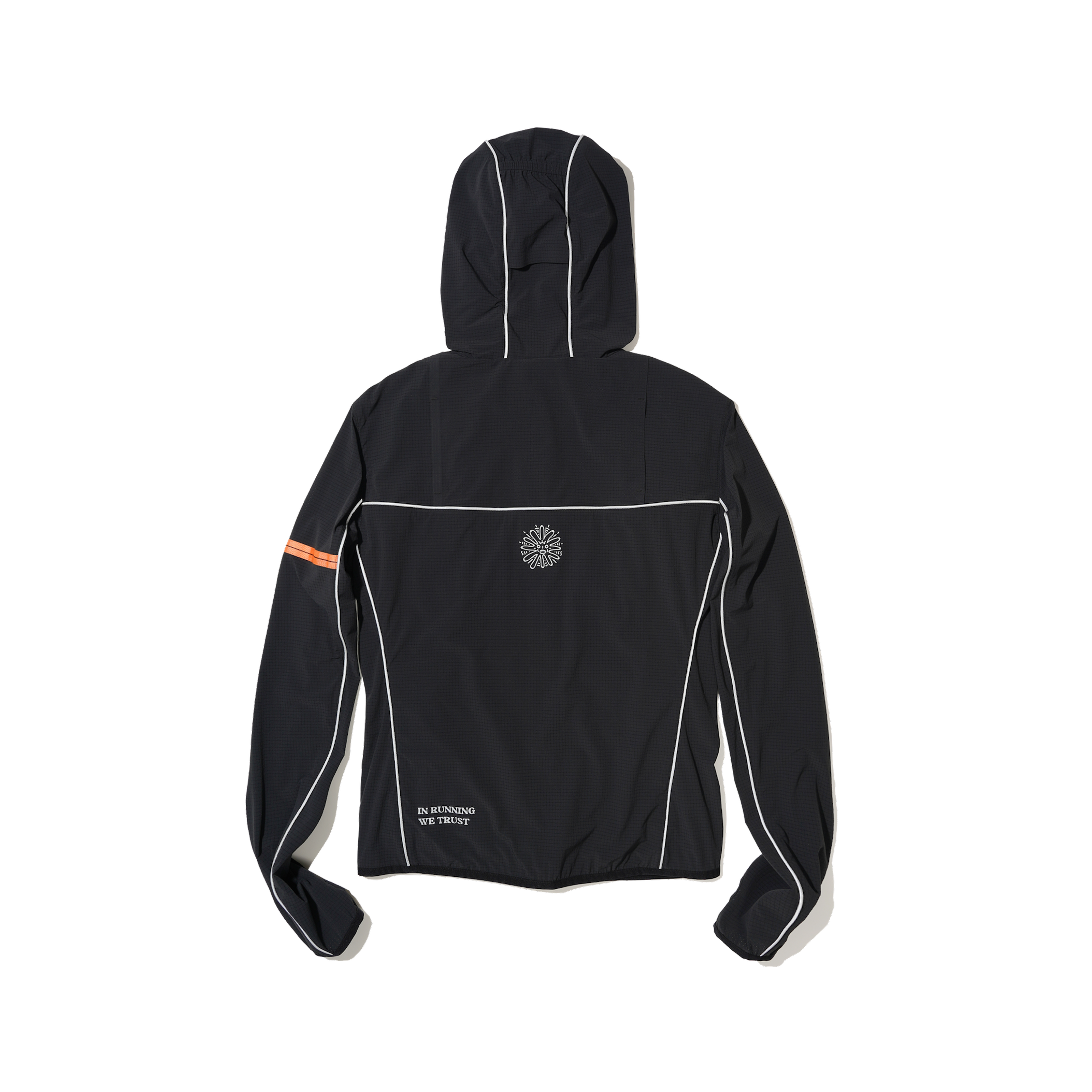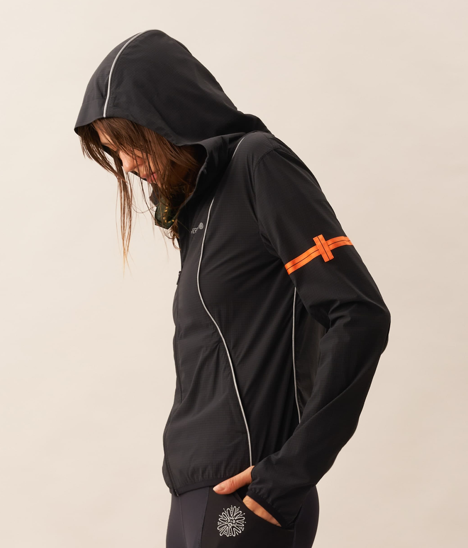 A packable 3D cooling and quick-drying skin jacket designed for women. Features 3D contouring with reflective strips for a slimming effect. Made with TORAY AIRTASTIC™ perforated cooling fabric for heat dissipation and quick drying. Packs down to the size of an A5 notebook.
