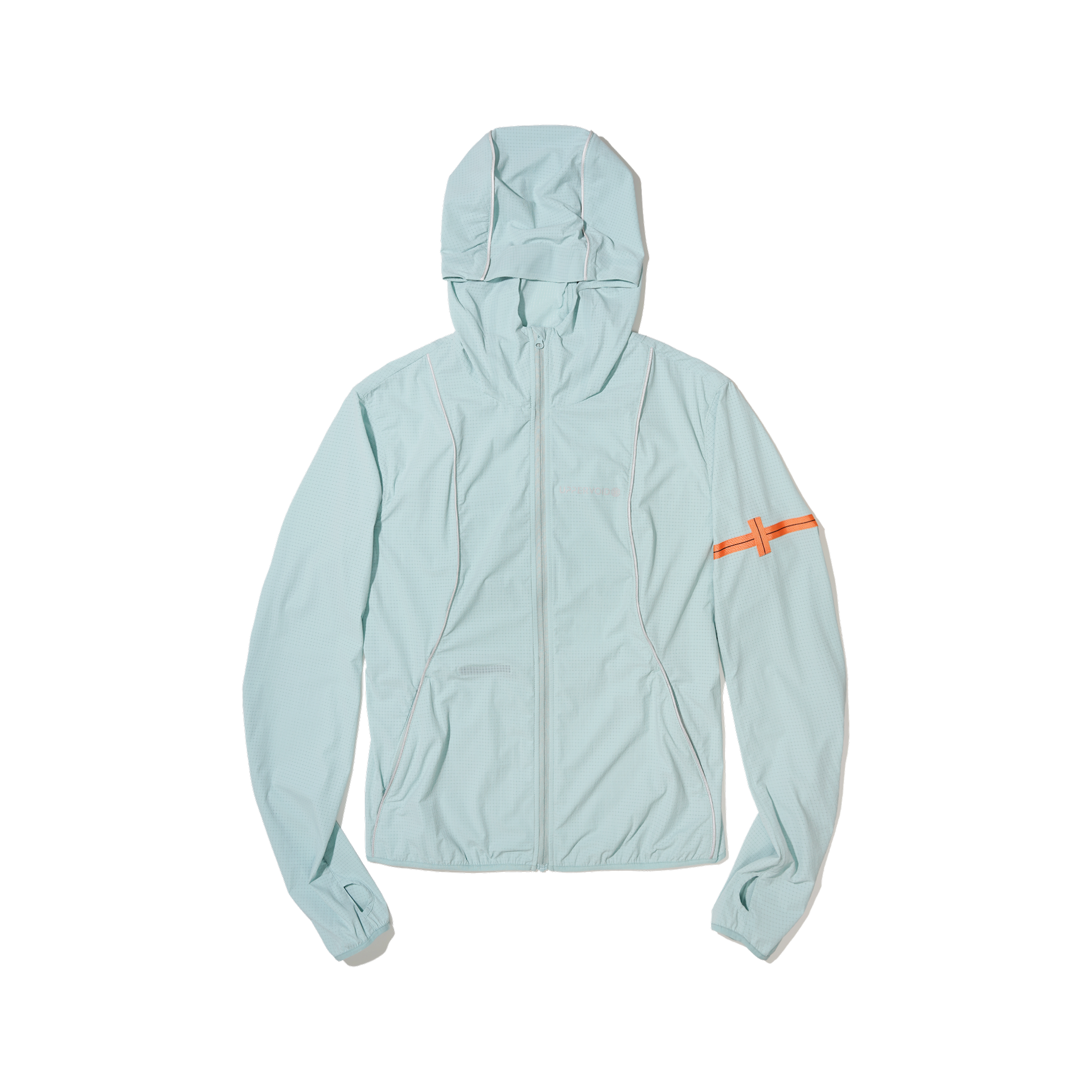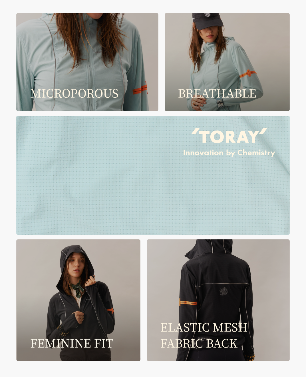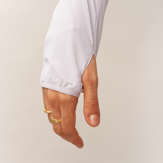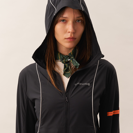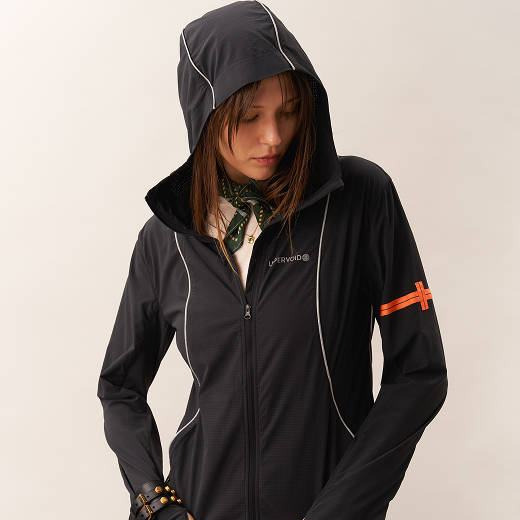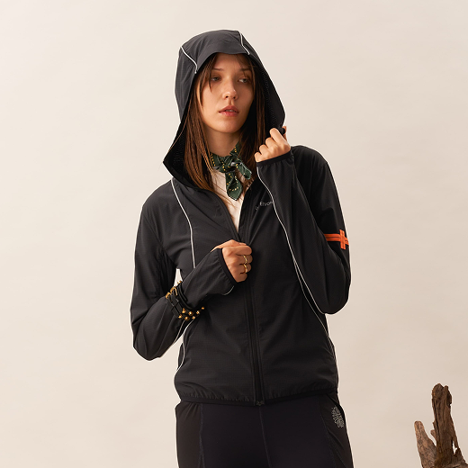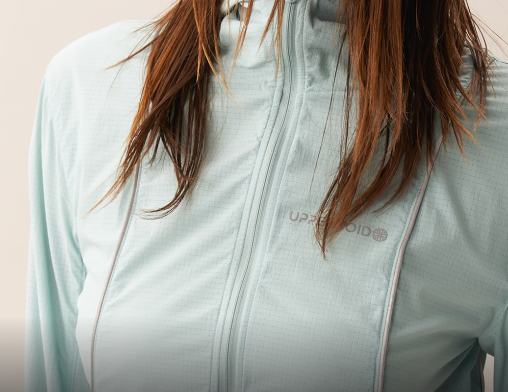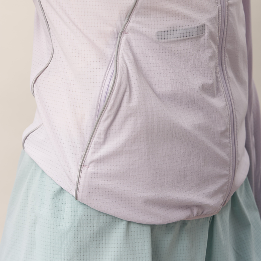 A packable 3D cooling and quick-drying skin jacket designed for women. Features 3D contouring with reflective strips for a slimming effect. Made with TORAY AIRTASTIC™ perforated cooling fabric for heat dissipation and quick drying. Packs down to the size of an A5 notebook.
