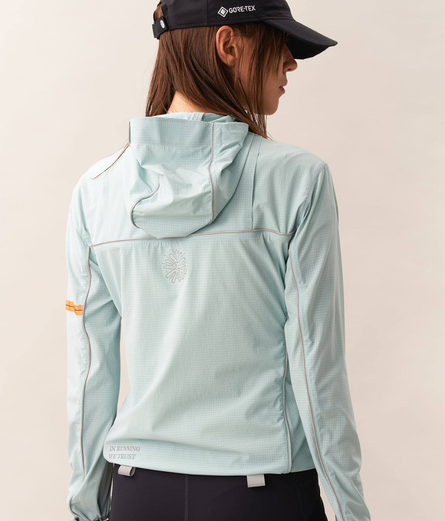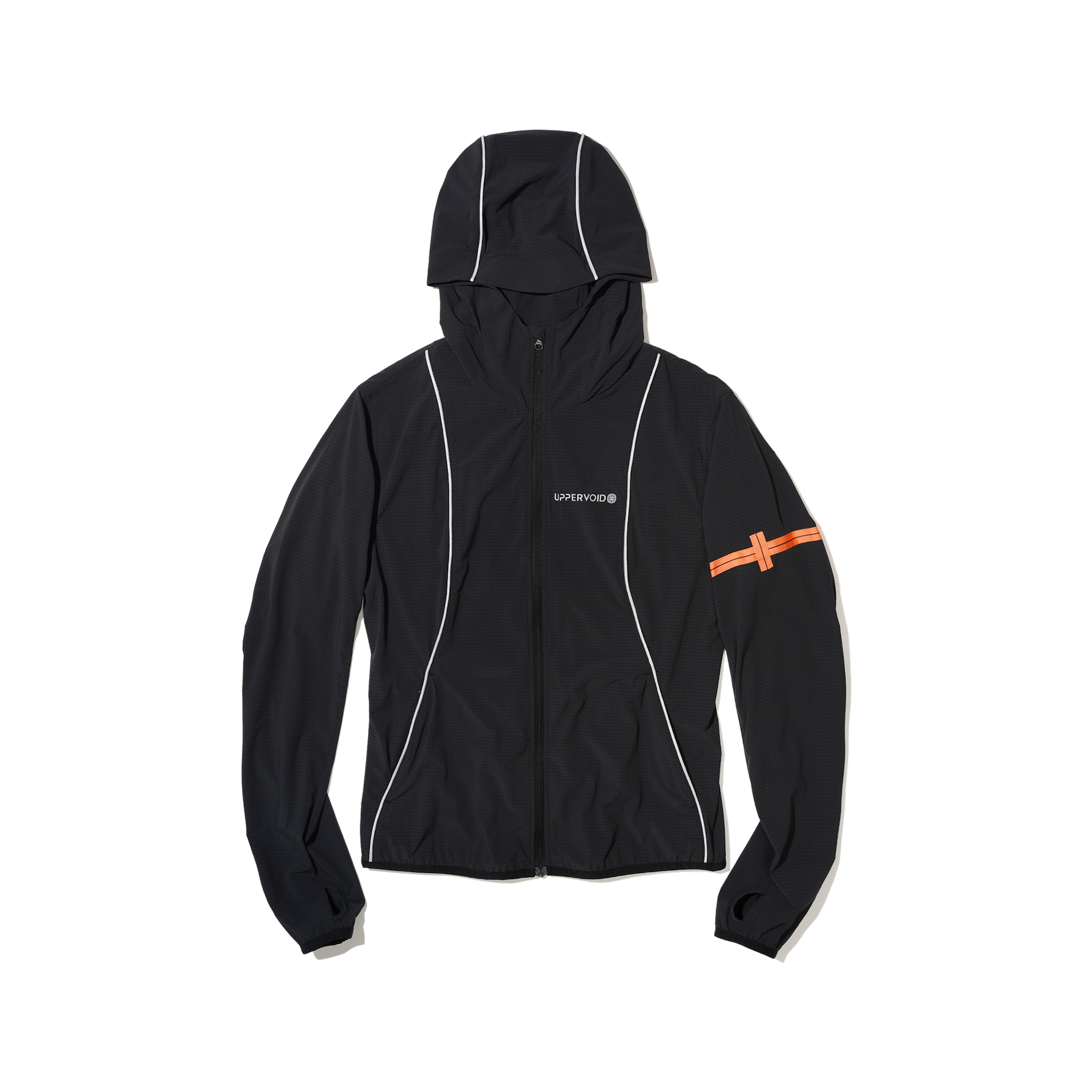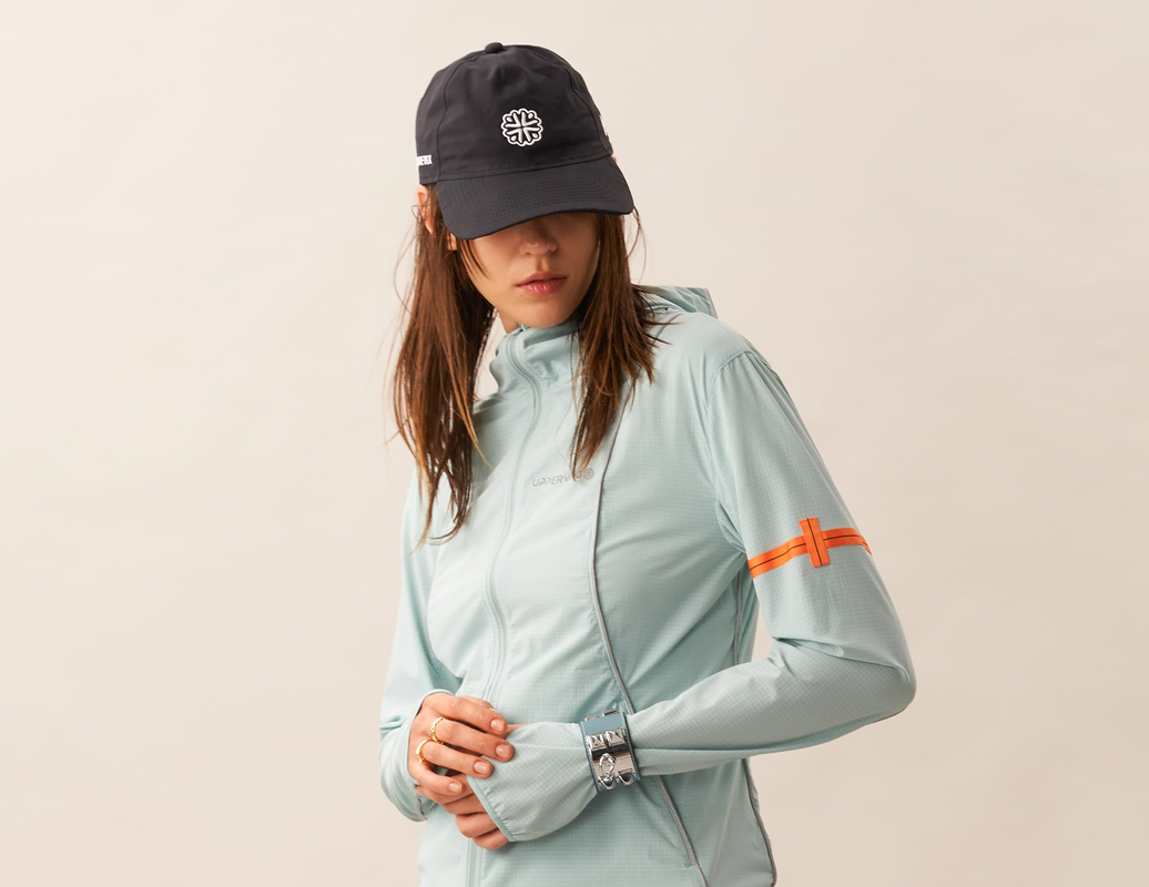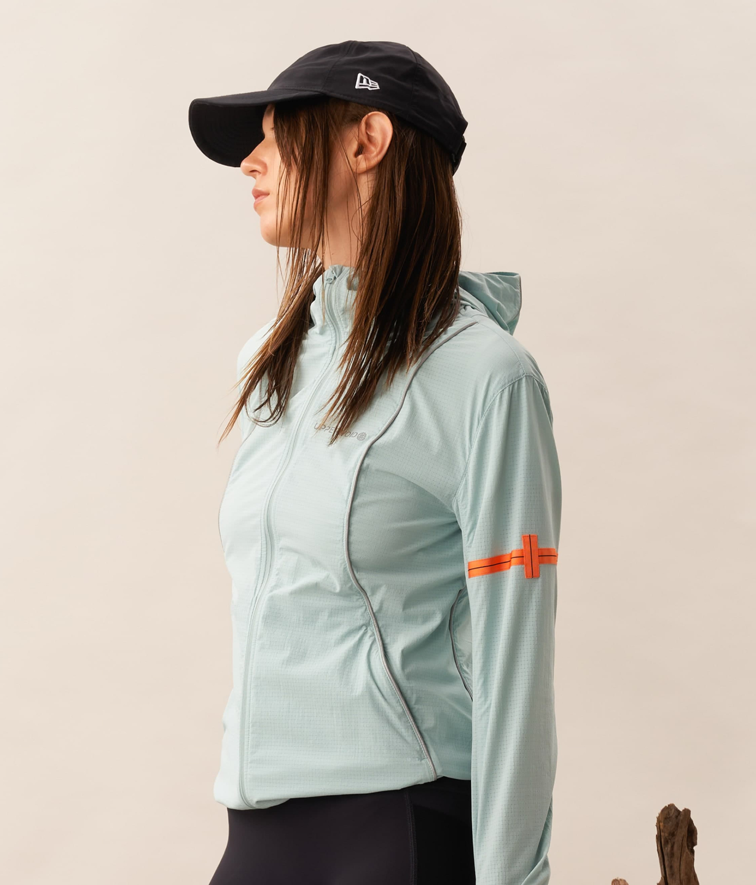 A packable 3D cooling and quick-drying skin jacket designed for women. Features 3D contouring with reflective strips for a slimming effect. Made with TORAY AIRTASTIC™ perforated cooling fabric for heat dissipation and quick drying. Packs down to the size of an A5 notebook.
