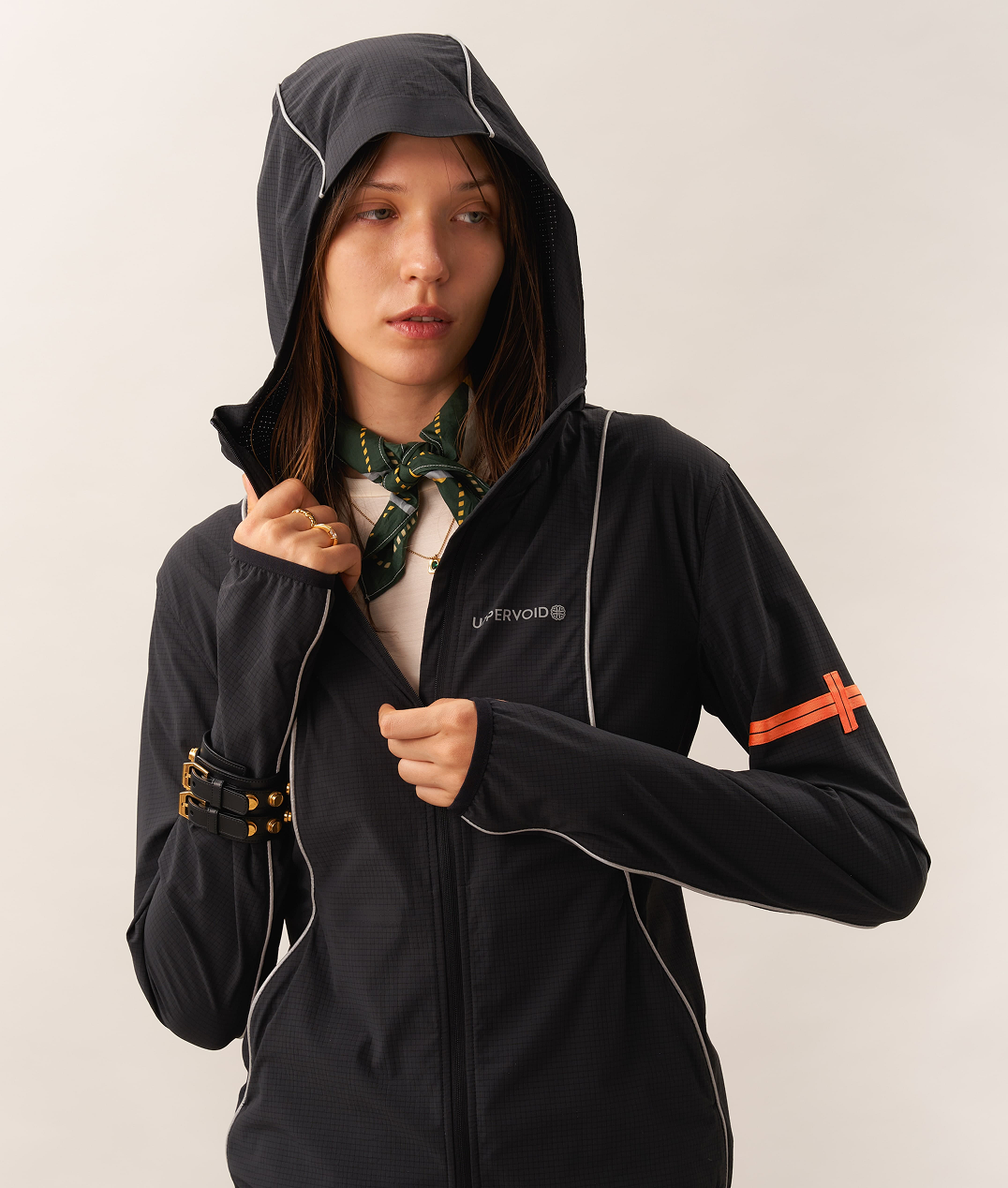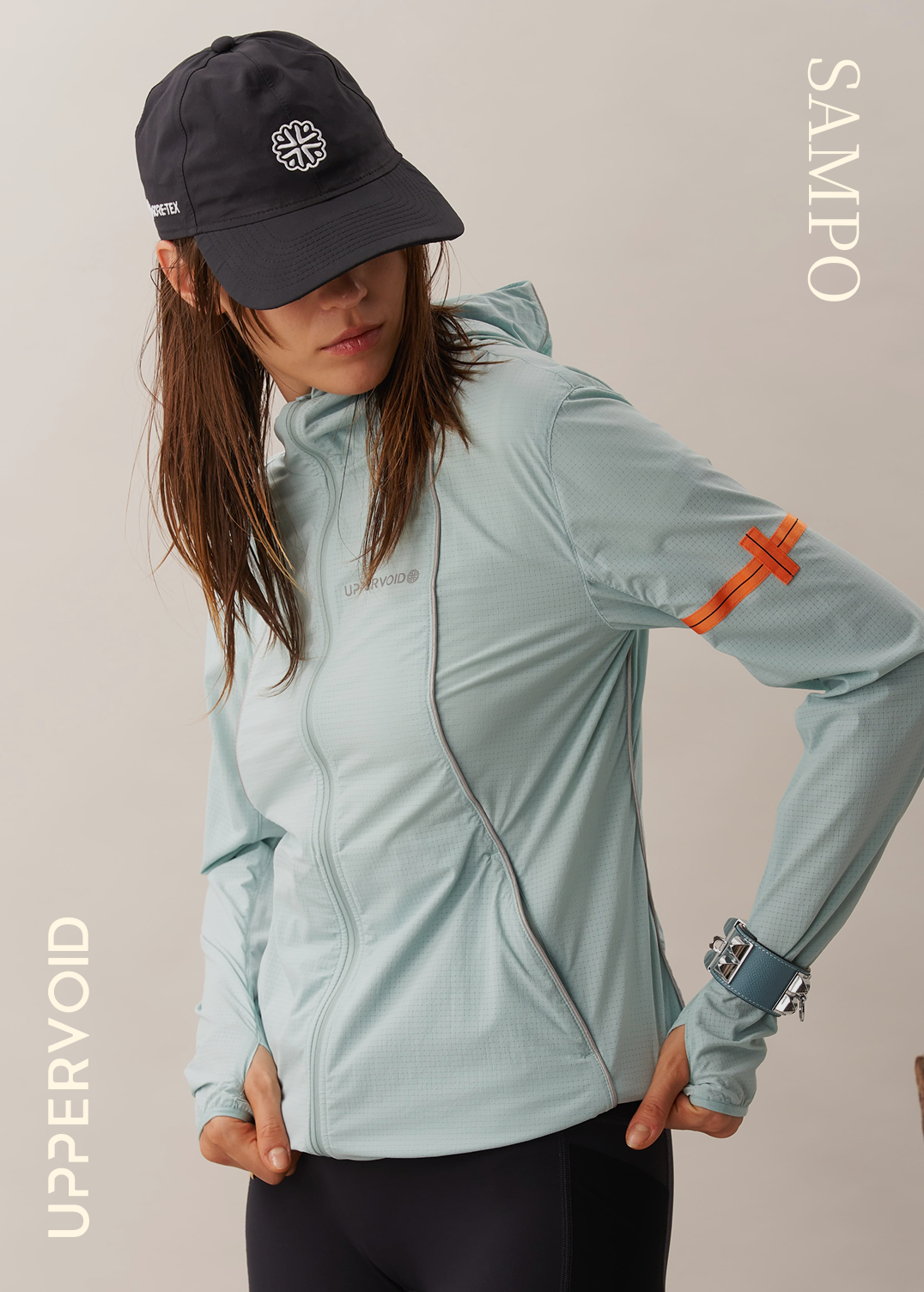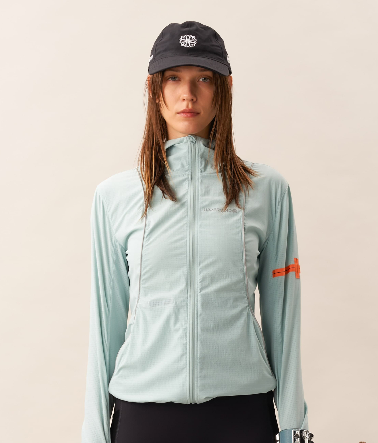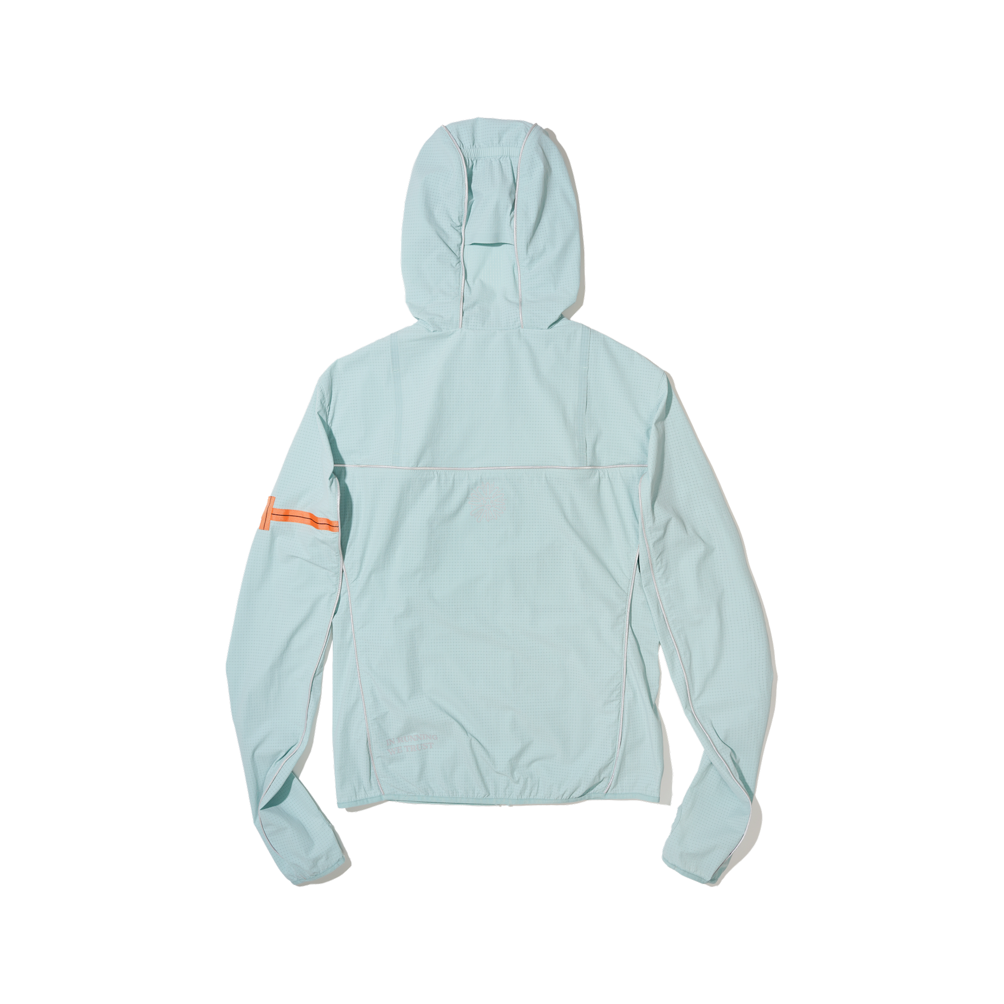 A packable 3D cooling and quick-drying skin jacket designed for women. Features 3D contouring with reflective strips for a slimming effect. Made with TORAY AIRTASTIC™ perforated cooling fabric for heat dissipation and quick drying. Packs down to the size of an A5 notebook.